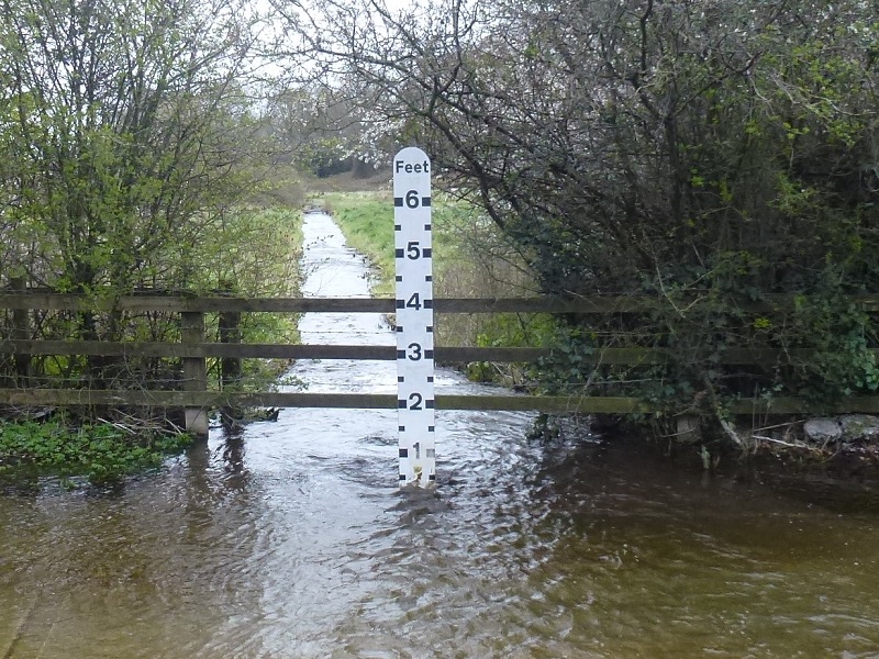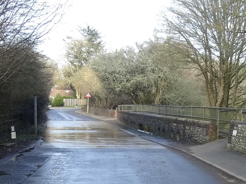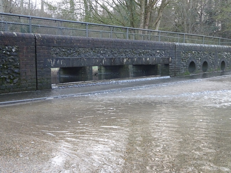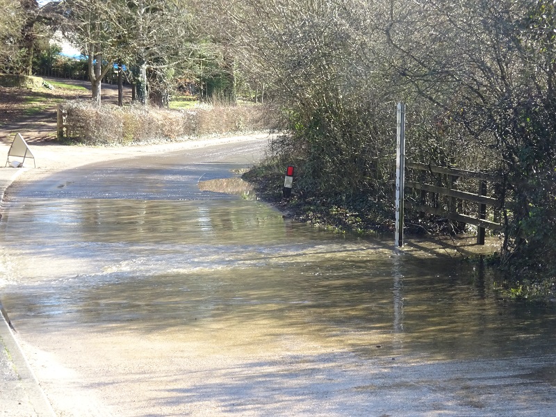 The photographs showing the flooding in Woodberry Lane in 2021 are courtesy of Rob Moriarty. Following the severe floods of the late 1990s, HCC added the depth gauge, cleared the hedgerow and replaced the three concrete pipes with rectangular slots under the bridge to ease the flow of water out of the Sling and swallow hole into the fields beyond. This remedial work has reduced the depth of the flooding of Woodberry Lane and prevented the floods encroaching on the houses in Glendale.